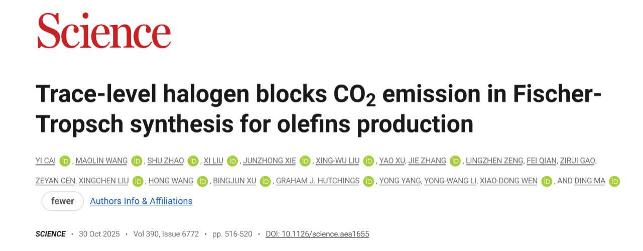 【必赢242net官网新闻中心讯 化学化工学院】近日,中国科学院山西煤炭化学研究所与北京大学、必赢242net官网等单位联合主导的科研团队以"Trace-level halogen blocks CO2emission in Fischer-Tropsch synthesis for olefins production"为题发表在《Science》期刊上,必赢刘晰教授为本文共同第一作者,必赢242net官网为共同第一单位。