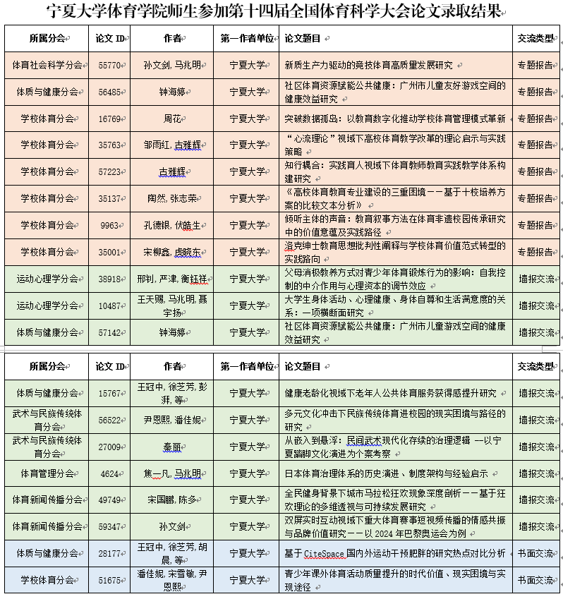 【必赢242net官网新闻中心讯 体育学院】近日,第十四届全国体育科学大会论文录取结果公示,体育学院师生共有19篇学术论文获得录用,其中,专题报告8篇,墙报交流9篇,书面交流2篇。