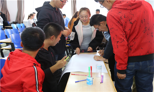 为让学生体会到“团结就是力量”,信息工程学院设计了小游戏“同舟共济”:“三颗星六个人,四颗半星九个人”。不论在生活还是在学习中,我们都必须团结一致,才能共同面对学业与生活中的困难。经济管理学院通过向学生提出“我最高兴的是?我最担心的是?我最希望的是?”三个看似简单的问题,引入与同学关系相关的“三个最”小游戏。他们在纸上认真书写答案,把内心深处的声音、对大学的期盼跃然纸上。在有趣的“班级蓝图大PK”游戏中,本场心理辅导落下帷幕,同学们以组为单位将描绘班级蓝图,现场温馨一片。