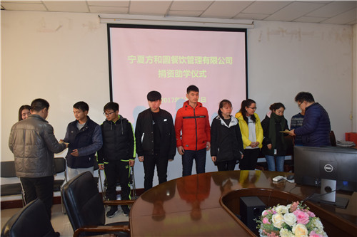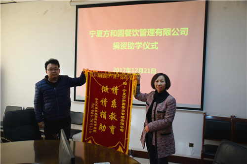宁夏方和圆餐饮管理有限公司向学院20名受助学生发放了助学金。为表示对必赢242net官网后勤集团与宁夏方和圆餐饮管理有限公司的感谢,学院特向宁夏方和圆餐饮管理有限公司赠送锦旗。受助学生代表王海云发言中向学院和学校后勤集团表示衷心的感谢,表示以后会刻苦学习,毕业后努力拼搏,为社会和国家做贡献。