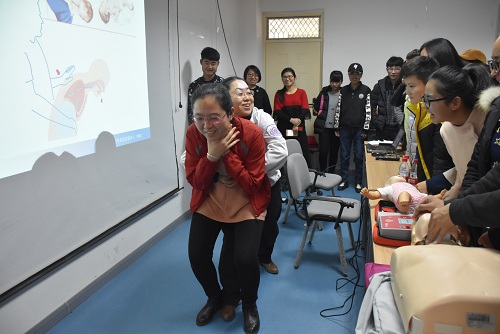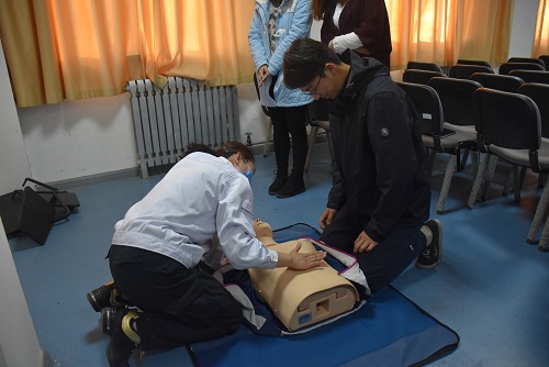 韩自华首先为在坐学员讲解了心肺复苏、排出气道异物等基本技能,接着详细介绍了心肺复苏的主要步骤,并现场为大家演示了如何进行胸外心脏按压,人工呼吸以及排除气道异物等技能以及注意事项。之后学员们进行了分组模拟实践操作,在三位培训师的耐心指导和讲解下,大家热情高涨,争相学习,表现出了极大的兴趣。通过此次培训,学生干部们学到了专业的现场急救知识,掌握自救互救基本知识与技能,获益颇多。