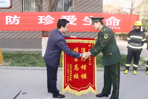 演练结束后,新华学院副院长赵永生为西夏区消防大队赠送了锦旗。消防官兵在中心区主干道摆放消防专用器材,为广大师生讲解各类火灾的特点、引发火灾的原因,演示灭火器和防毒面具等器材的使用方法。师生们纷纷表示会从身边做起,注意消防安全,确保校园安全。