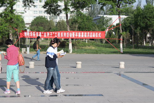 启动仪式结束后,同学们开始了晨读,大家散布在金波湖畔的每一个角落,湖畔微风习习,远远近近都是朗朗的读书声,一个个美丽的梦想,在书与美景的画卷里慢慢展开。(责任编辑:陈佩)
