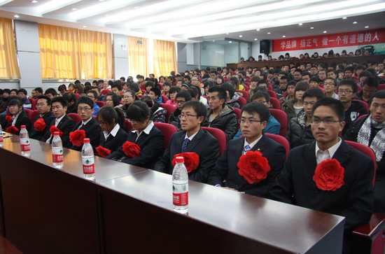 化学化工学院党总支书记李嗣丞宣读了《关于命名表彰第二届化学化工学院品牌学生的决定》。据悉,“品牌学生”是化工学院学生经过民主推介,从各班级选出的优秀学生代表,他们学习优秀、勤奋努力、勇于探索、敢于创新,面对学习上的困难能够积极主动地应对,面对生活上的艰辛能够自强自立、奋勇向前,面对学校的需要能够顾全大局,具有当代大学生宝贵的可信可靠、敢为人先、勇于奉献的崇高精神,是当代大学生学习的榜样。“品牌学生”已连续评出两届,第二届“品牌学生”共评出12名,有10名同学在本次报告会上介绍了他们的先进事迹。他们的事迹感动了全场师生,有的同学发言动情处潸然泪下,泣不成声,让在场师生流下了感动的泪水,赢得了大家一次次热烈的掌声。