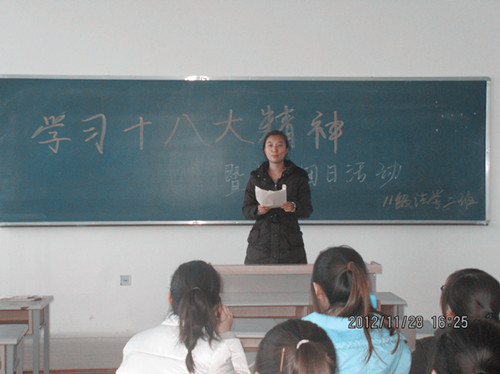 在2010级思政(2)班的班会上,秦强同学结合自己社会实践的经历,谈了对社会公平和共同富裕的认识。在谈及进一步深化改革所取得的成就时,他说到,党的十八大是改革发展重要的时期,意义深远。作为大学生,我们要更加珍视伟大时代赋予大学生的使命,努力学习,锻炼自己,有朝一日为祖国的建设贡献自己的力量。在2011级行管(1)班的主题班会上,同学们则以十八大的“五位一体”“科学发展观”“八项要求”等八个关键词展开讨论,同学们结合自己的理解做了解读探讨。