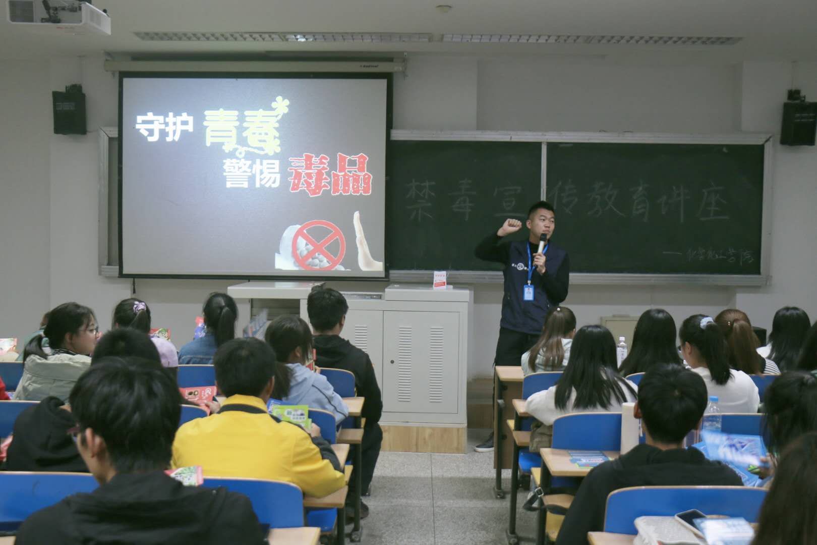 张琦讲述了吸食毒品对个人、对家庭、对社会的危害,并给新生们列举了发生在身边的例子和禁毒电影中经典片段,并对同学们提出的相关问题一一解答。他呼吁同学们要向自己身边的人讲解毒品的类型和危害,警惕毒品,远离毒品,共同创建无毒品校园和无毒品社会做出自己的贡献。