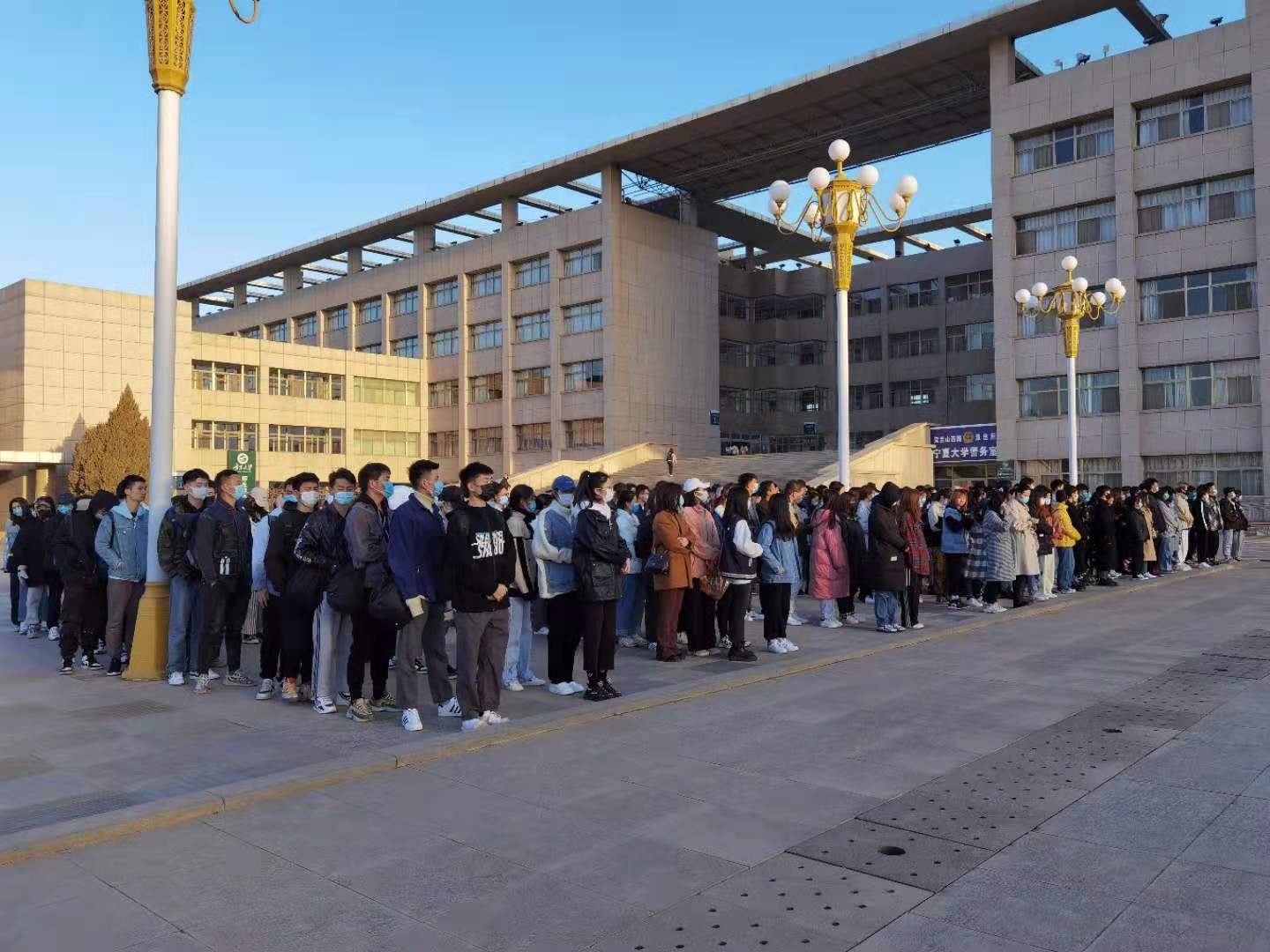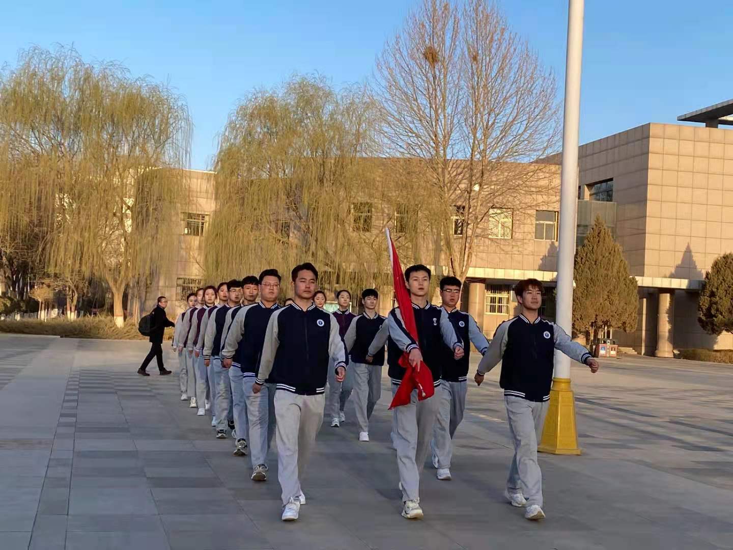 伴随着雄壮的国歌声,鲜艳的五星红旗在国旗护卫队的守护下冉冉升起,在场师生脱帽肃立,齐声高唱《义勇军进行曲》。
