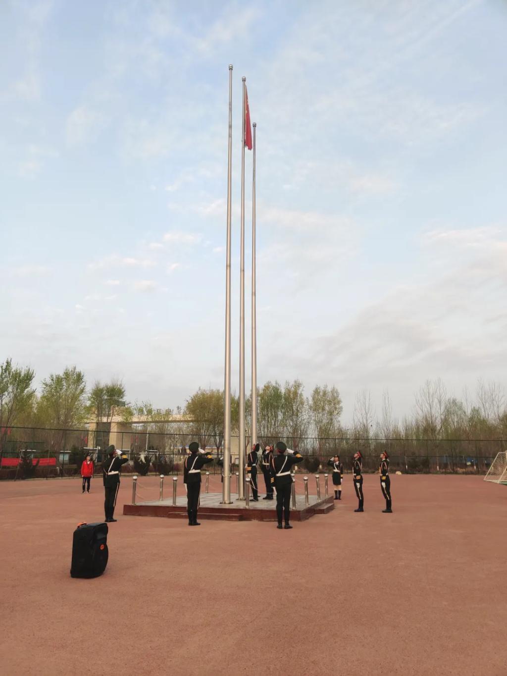 随着国歌声响起,全体人员静默肃立,向国旗行注目礼。