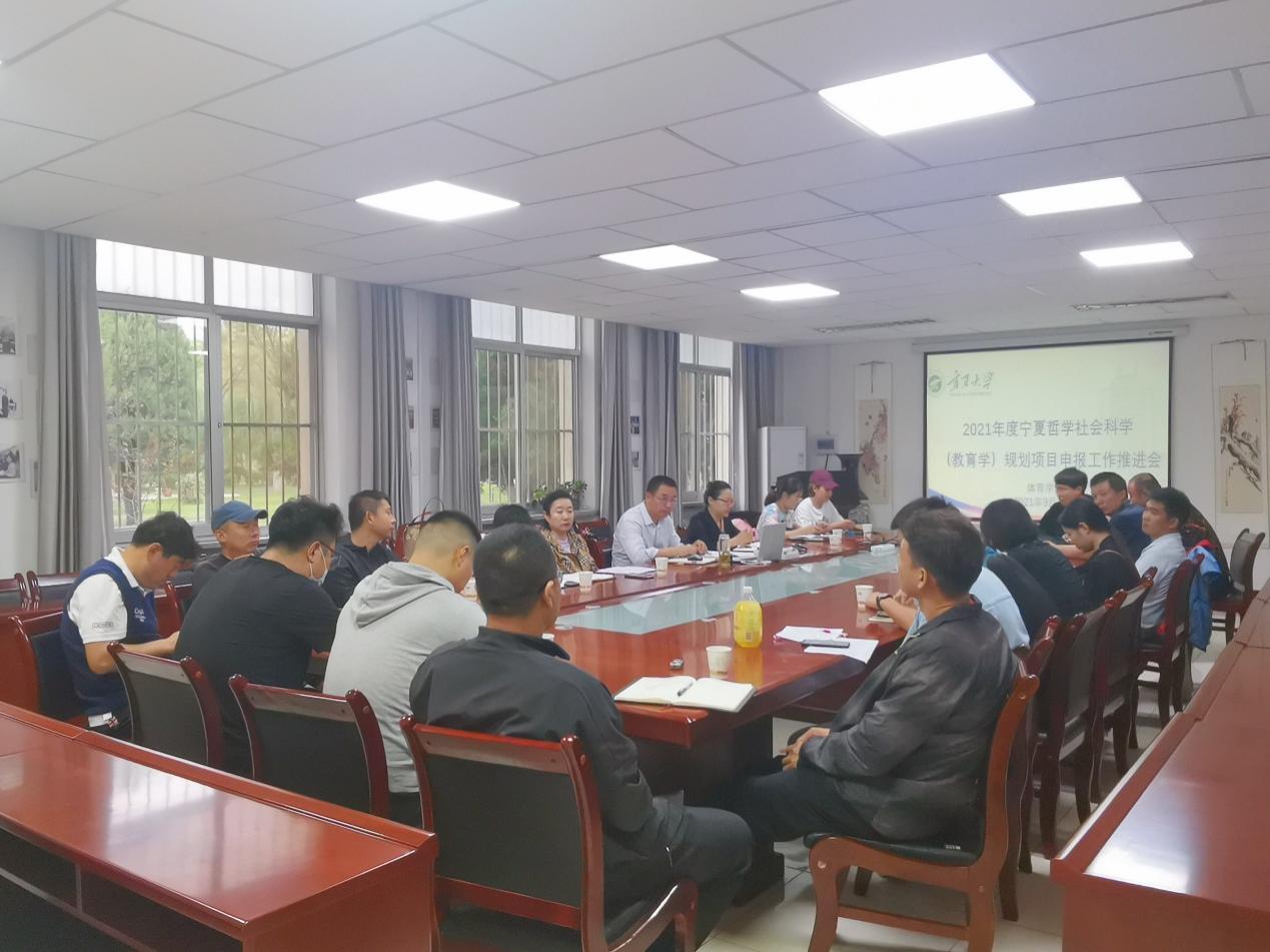 【必赢242net官网新闻中心讯 体育学院】9月14日下午,体育学院在学术报告厅召开2021度宁夏哲学社会科学(教育学)规划项目申报推进会,会议由院长咸云龙主持,学院副书记严津、副院长徐赟、马兆明以及全院共计21名中青年教师出席会议。
