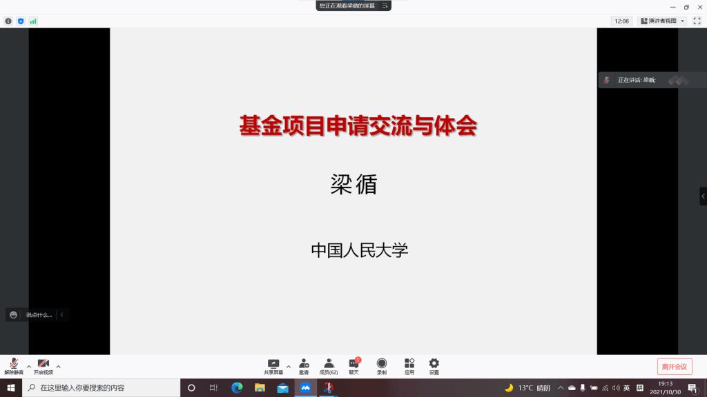 【必赢242net官网新闻中心讯 经济管理学院】为积极推进学院国家自然科学基金项目申报工作,提高申报成功率,2021年10月30日晚7时,经济管理学院举办了国家自然科学基金申报线上辅导报告会。会议由院长杨国涛教授主持,邀请到中国人民大学教授、博士生导师梁循教授为全院师生作分享讲座。全院百余名教师和硕士博士研究生参加了本次线上辅导报告会。