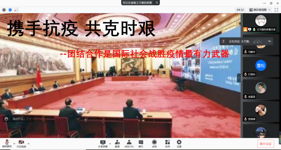 “青春飞扬”临时党支部线上学习了习近平总书记重要文章《团结合作是国际社会战胜疫情最有力武器》。支部书记王文雅介绍了本次活动的主要内容、意义,带领大家共同学习了习近平总书记2020年1月至4月期间讲话、谈话、信函、慰问电、与外国领导人和国际组织负责人通电话中有关开展抗疫国际合作内容的节录。她说,习近平总书记强调,当前新冠肺炎疫情正在全球蔓延,给人民生命安全和身体健康带来巨大威胁,给全球公共卫生安全带来巨大挑战。国际社会最需要的是坚定信心、齐心协力、团结应对,全面加强国际合作,携手赢得这场人类同重大传染性疾病的斗争。只要我们同舟共济、守望相助,就一定能够彻底战胜疫情,迎来人类发展更加美好的明天!支部党员作了交流发言,赵沫同学讲到,病毒没有国界,疫情不分种族,人类是休戚与共的命运共同体,唯有团结协作、携手应对,国际社会才能战胜疫情,而我们能做的就是服从党的领导,听从党的指挥!哪里有什么岁月静好,只是有人在为你负重前行。跟着党走,我们是幸福的人!