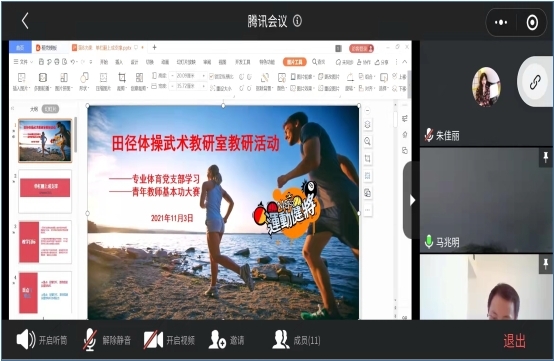以赛促练、以赛促教。为提高青年教师业务能力和教学水平,最大限度地挖掘青年教师潜力,帮助青年教师在青年教师基本功大赛中取得优异成绩。田径、体操、武术党小组针对青年党员教师张爱福老师和丁腾老师的参赛作品进行了交流学习。两位老师以“立德树人”“三全育人”为核心,精心设计教学过程,模拟授课层次分明、张弛有序。随后,参会教师分别从课程思政引入、教学内容设计等方面进行了交流研讨,并提出了改进建议。