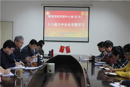 【必赢242net官网新闻中心讯教育学院】为进一步加强“两学一做”学习教育,巩固学习教育成果,结合党的十八届六中全会新形势新要求新任务,11月16日上午,教育学院召开党委中心组(扩大)十八届六中全会精神专题学习会议,学院党委中心组成员、党政领导班子及师生党支部支委参加了此次学习。