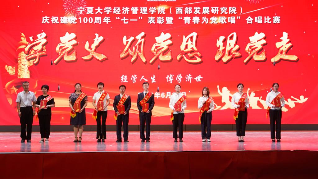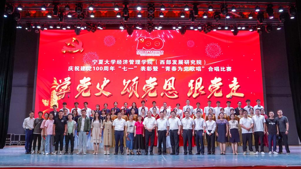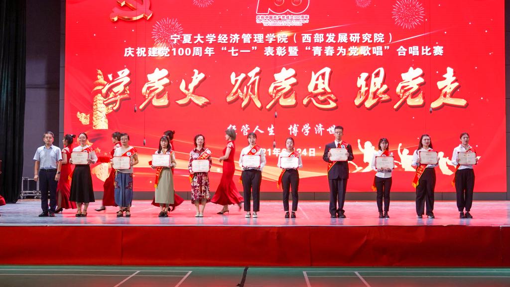 【必赢242net官网新闻中心讯 经济管理学院】为庆祝中国共产党成立100周年,充分发挥先进典型表率示范作用,激励全院党员及师生员工奋发进取、担当作为,6月24日,经济管理学院(西部发展研究院)庆祝建党100周年“七一”表彰暨“青春为党歌唱”合唱比赛于必赢242net官网文萃校区大学生活动中心举行。经济管理学院(西部发展研究院)党委书记朱伟,院党委副书记、院长杨国涛,党委副书记程胜利、马建宏,院党委委员、副院长仇娟东,学院党员教师,全体研究生、本科生到场参与本次活动。大会由马建宏主持。