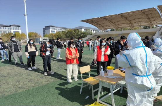 10月28日上午和11月30日下午,中卫市中医院的医护人员在中卫校区田径场开展了两轮校区全员核酸检测工作。期间,智工学院由学生党员牵头的“青年突击队”志愿者积极参与,组织同学们10人一组有序排队,指导大家提前准备好健康融合码,并提醒检测同学间隔1米排队。一小时内,学院900名学生和17名老师秩序井然、安全高效地完成了咽拭子采集工作。绿茵场上志愿红,胸前党徽万斤重。疫情面前,学生党员主动担当,冲锋在前,生动诠释着入党初心,也让鲜红的党旗在战“疫”一线高高飘扬。
