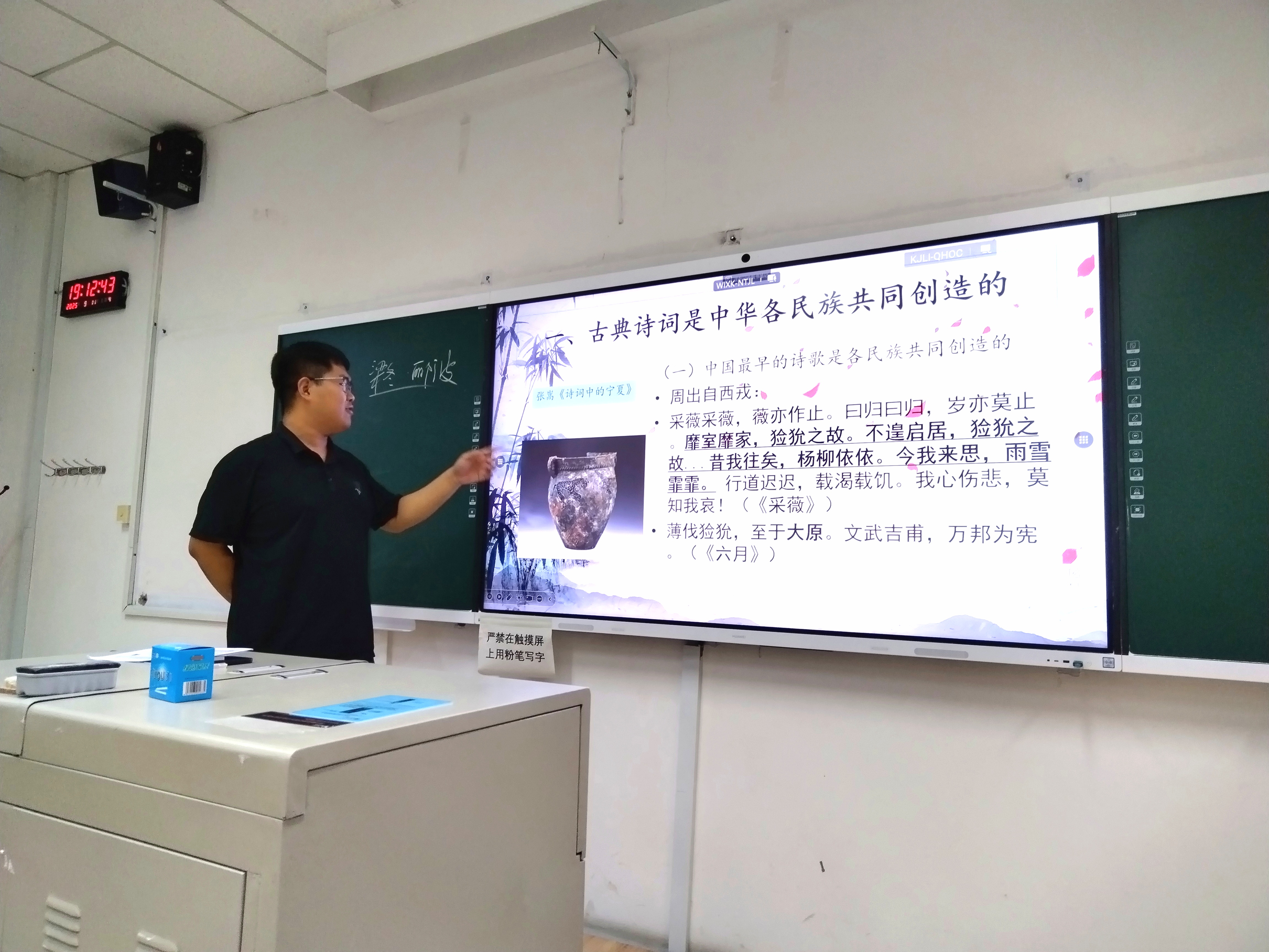 在213教室,裴俊杰别出心裁地以《古典诗词里的中华民族共同体》为题,从文学角度切入民族团结主题。他精选自《诗经》至唐诗宋词中体现各民族交往交流交融的经典作品,解读诗词背后各民族文化交流互鉴的历史画面。裴俊杰深厚的文学功底和独到的解读视角,让同学们在品味古典诗词之美的同时,感受中华民族共同体意识的文化积淀。